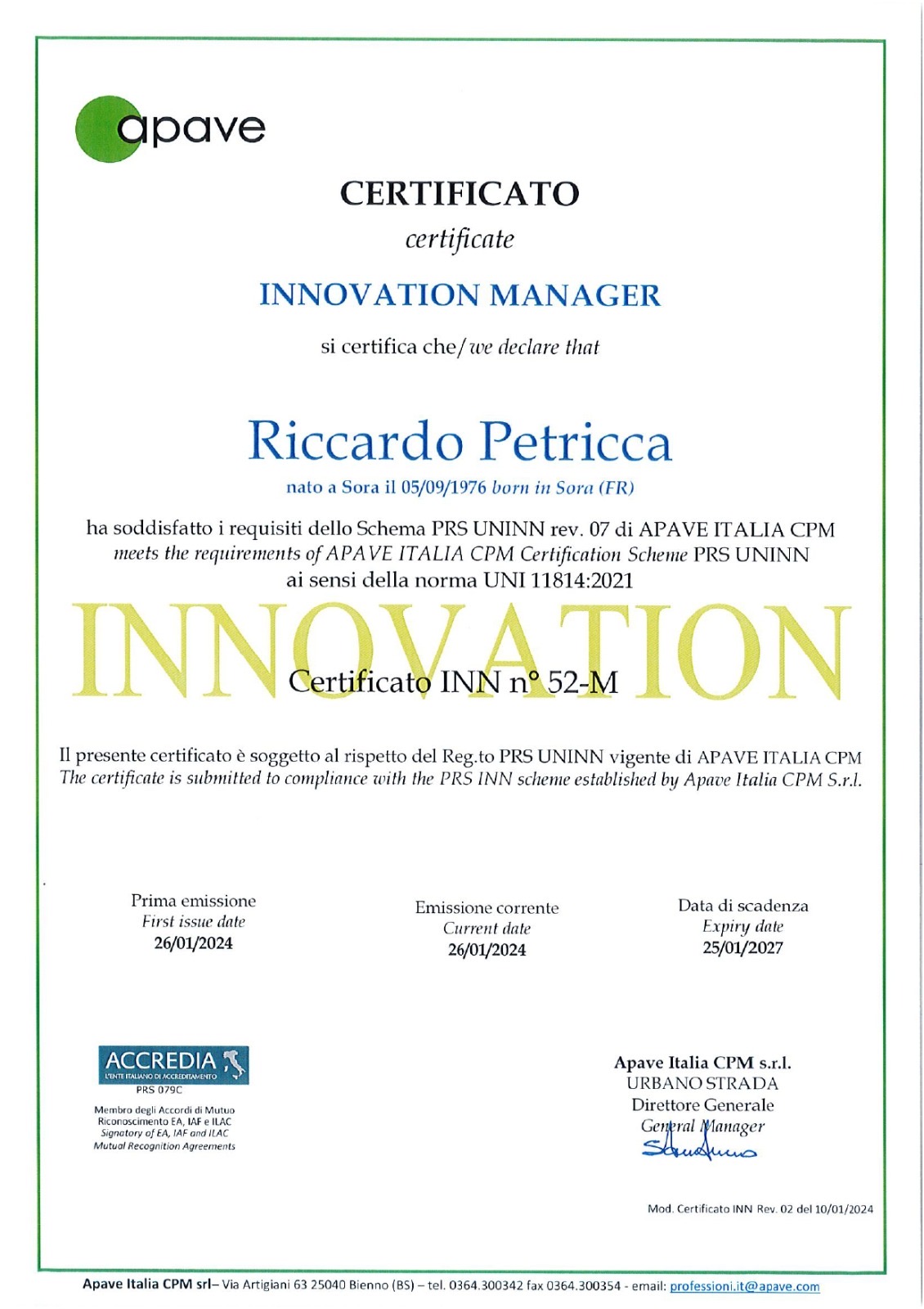 Innovation Manager presso il MISE (Ministero dello Sviluppo Economico) e UNIONCAMERE certificato UNI ISO 11814 da APAVE ITALIA CPM come risultante dal sito Accredia e CISA per i progetti di Cybersicurezza.